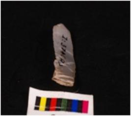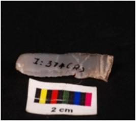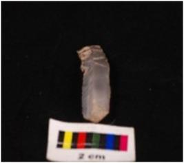 | Description / विवरण | Parallel sided blade on chalcedony with a mid-ridge on the dorsal side, diffused bulb on ventral side, regularly retouched left cutting edge of dorsal side, distal end broken and the raw material given heat treatment. |