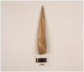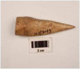 | Description / विवरण | A bone point with pointed one end other end broad cracks visible two ridges on surface |