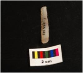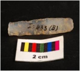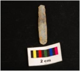 | Description / विवरण | Parallel sided microlith blade with mid ridge on dorsal and use wear marks on cutting edge. Triangular in section and deffused bulb on proximal. |