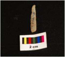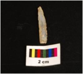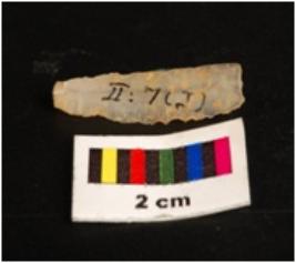 | Description / विवरण | Blade with two working edges, retouches can be seen, striking platform seen, deffused bulb on ventral side, ridge along the dorsal part distal end broken. |
