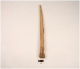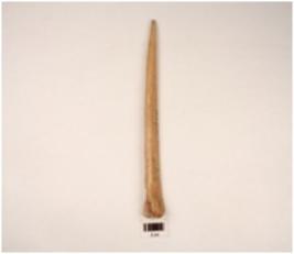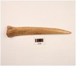 | Description / विवरण | A bone point with flat polished surface cream in colour pointed one end slightly damaged other end thick A ridge on surface shallow depression cut marks on surface |