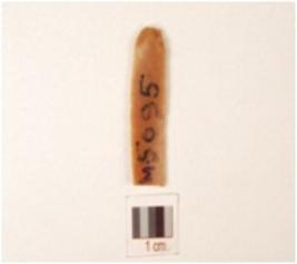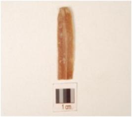 | Description / विवरण | Chert blade with trapezoidal cross-section, use-wear marks along the cutting edge, prepared platform and prominent bulb on ventral side. |