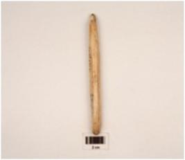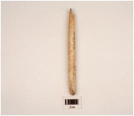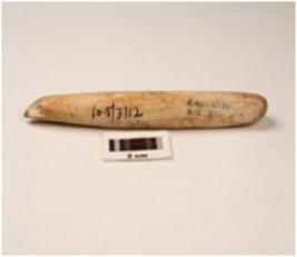 | Description / विवरण | A bone spear head with flat surface as rectangualr cross section pointed end broken other damaged slightly polished surface |