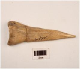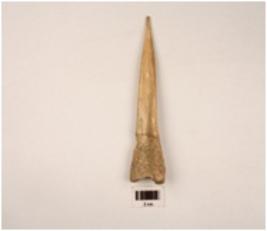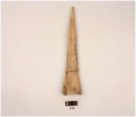 | Description / विवरण | A bone point with flat surface pointed end slightly damaged other end thick and broad mended surface polished surface rectangular cross section |