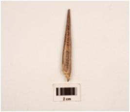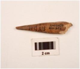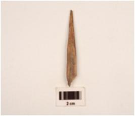 | Description / विवरण | A bone point with flat surface pointed one end other end broad both ends partially damaged brown in colours crack visible on one side two ridges on upper surface |