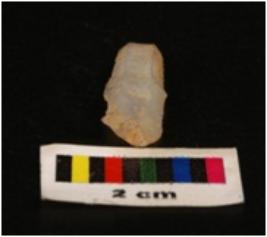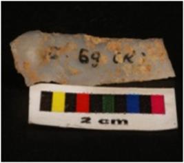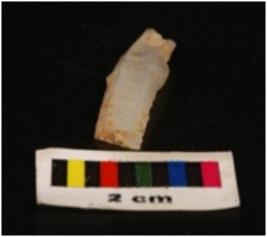 | Description / विवरण | Chalcedony parauel sided blade with a double ridge, trapezoidal section, regularly retouched edges. |