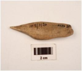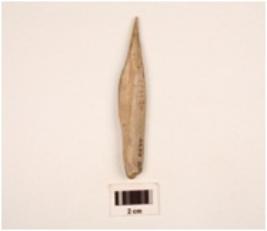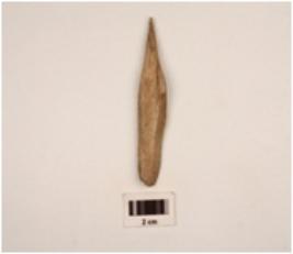| Description / विवरण | A bone point with flat polished surface a groove on one side one end pointed rectangular crose section cracks visible surface |