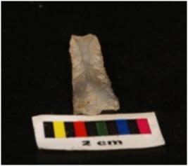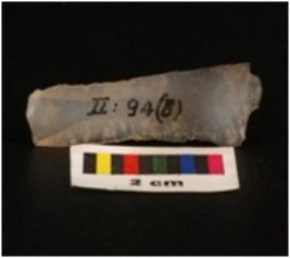 | Description / विवरण | Chalcedony parauel sided blade with a double ridge, regularly retouched edges, trapezoidal section. |