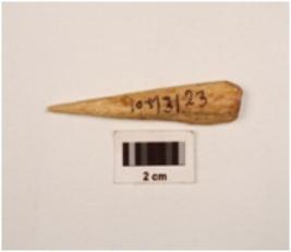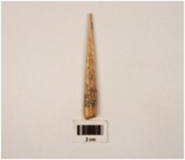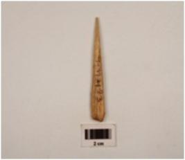 | Description / विवरण | A bone point with pointed end other end broad, rectangular in section polished surface slightly damaged at pointed end. |