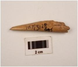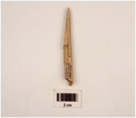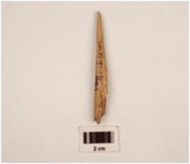| Description / विवरण | Fragmnet of bone point with polished surface damaged from both ends one end slightly damaged cracks visible on surface circular cross section |