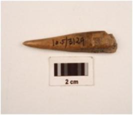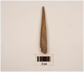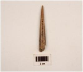 | Description / विवरण | A bone pointed with smooth polished surface ridges on surface circular cross section pointed end slightly damaged |
