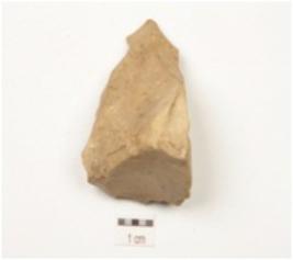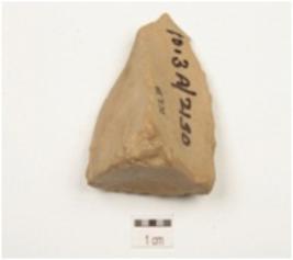 | Description / विवरण | A flake made on chert, wear mark along the cutting edge and flake scars on surface. |