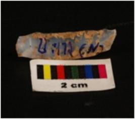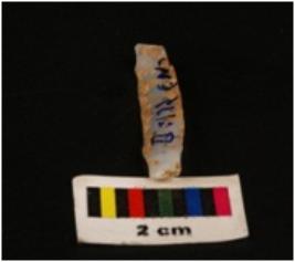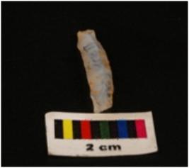 | Description / विवरण | Microlithic blade with use-wear marks on cutting edge, prominent mid ridge on dorsal surface, bulb on proximal end. |