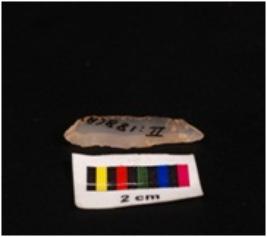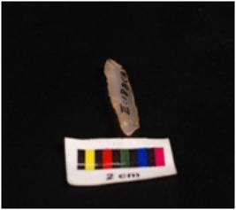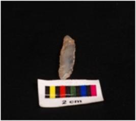 | Description / विवरण | Parallel sided blade of chalcedony with a single mid-ridge, triangular section, regularly retouched edges and proximal and distal end broken. |