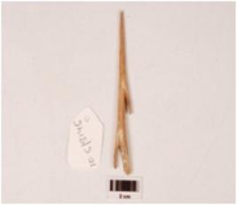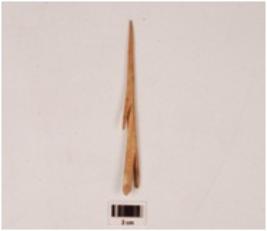 | Description / विवरण | A harpoon made on bone with barbs, polished surface, sharp pointed tip and broken from other end. |