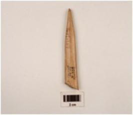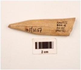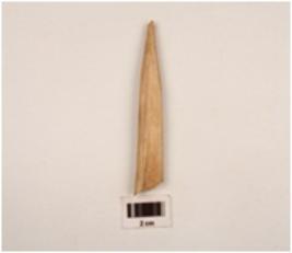 | Description / विवरण | Fragment pf an arrow head made on bone pointed at one end thick at other end slightly damaged at one side well polished and smooth surface |