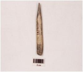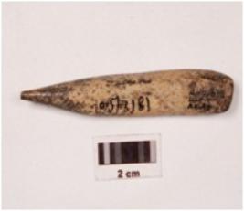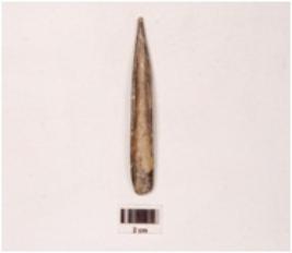 | Description / विवरण | A point made on charred bone with smooth and polished surface, it is pointed surface, it is pointed at one end and the other end is flat, slightly broken at the working end. |
