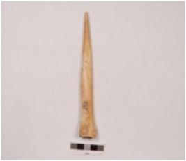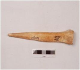 | Description / विवरण | An point made on bone with a smooth and polished surface pointed at one end and broad at the other end, broken at the tip. |