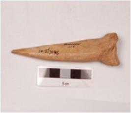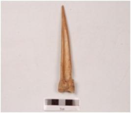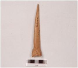 | Description / विवरण | An point made on bone with a smooth and polished surface, pointed at one end while the other end is broad, a wide groove on the surface, broken at the tip. |