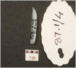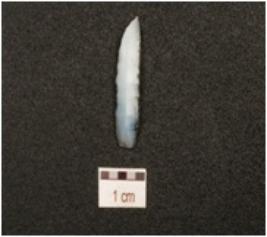 | Description / विवरण | A penknife blade made on chalcedony, end struck flake, bulb absent, sharp cutting edge, blunted one side, blade scars on dorsal surface and triangular cross section. |