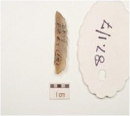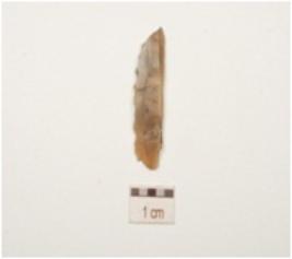 | Description / विवरण | A penknife blade made on chalcedony, end struck flake, bulb absent, sharp cutting edge, blunted one side, blade scars on dorsal surface and triangular cross section. |