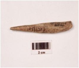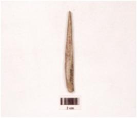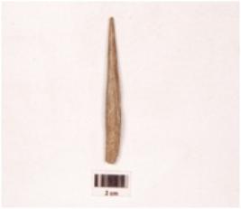 | Description / विवरण | A point charred bone pointed at one end white it is broken at the other end, smooth and polished, surface slightly damaged. |