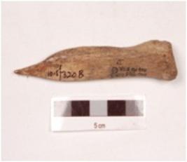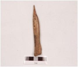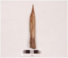| Description / विवरण | An point made on charred bone with a pointed end and properly polished surface, it has a wide groove on one side and broad at the other end. |