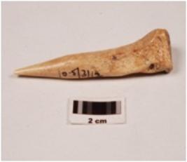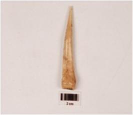| Description / विवरण | A bone point made on charred bone, pointed at one end, it has smooth and polished surface, slightly damaged. |