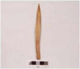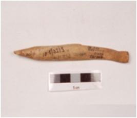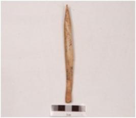 | Description / विवरण | An point made on bone with smooth and polished surface, it is pointed at one end, a groove on one side, slightly damaged. |