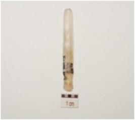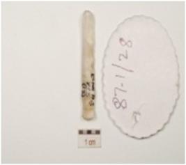 | Description / विवरण | A blade made on chalcedony, prepared platform on proximal end, use marks on working edges and trapezoidal cross section. |