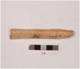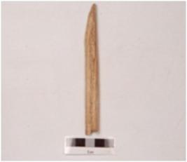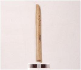 | Description / विवरण | An slicer head made on bone with a polished surface, pointed at one end and groove on the surface, partly damaged. |