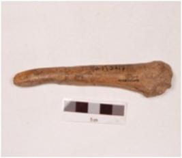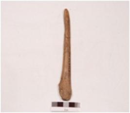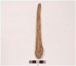| Description / विवरण | An slicer cutter made on charred bone with smooth and properly polished surface, pointed at one end, it has a wide groove on one side, mended. |