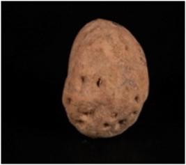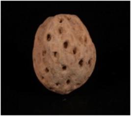| Description / विवरण | A handmade, well baked, terracotta sling ball, oval in shape. |