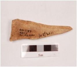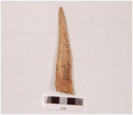 | Description / विवरण | An arrow head made on bone with smooth and polished surface pointed at one end and the other end is broad. |