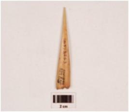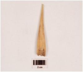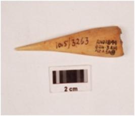 | Description / विवरण | Fragment of a bone point, plano convex in section, very finely polished on both sides, slightly broken at one end, pointed at other end, smooth surface. |