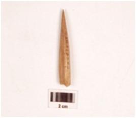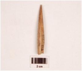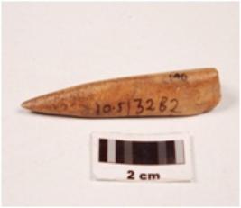 | Description / विवरण | Fragment of a bone point, slightly broken at one end, polished on both sides, smooth surface. |