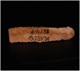 | Description / विवरण | Chert blade, it has two ridges on dorsal side. Retouching on the edges. Bulb on ventral, use wear marks on cutting edge and prepared platform. |