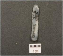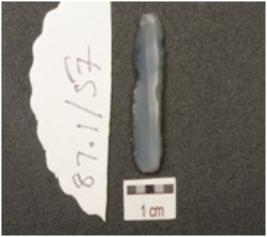 | Description / विवरण | Pen knife blade made on chalcedony, prominent bulb on ventral surface, triangular cross section, two ridges on dorsal surface and wear marks with regular retouched along cutting edges. |