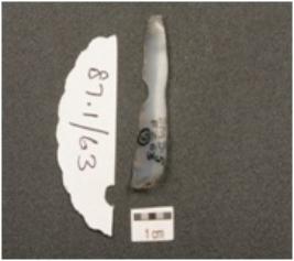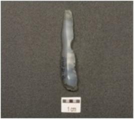 | Description / विवरण | Notched blade made on chalcedony with wear marks along cutting edges, prominent ridge on dorsal surface, triangular cross section and prominent bulb on ventral surface. |