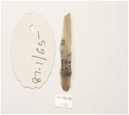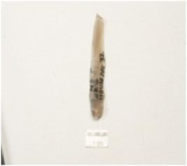 | Description / विवरण | Pointed blade made on end struck chalcedony, wear marks along cutting edges, pointed end broken, prominent bulb on ventral surface and a ridge on dorsal surface. |