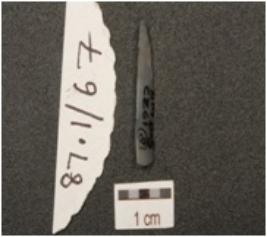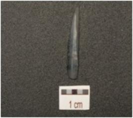 | Description / विवरण | Backed point made on chalcedony, pointed distal end, wear marks with retouched cutting edges and ridges on dorsal surface. |
