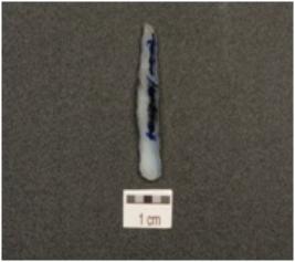 | Description / विवरण | A blade made on end struck chalcedony flake, flake scars on dorsal side, bulb of percussion on ventral side, prepared platform proximal end and partly retouch cutting edges. |