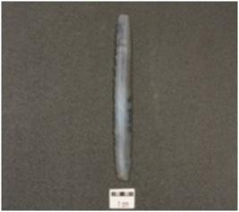 | Description / विवरण | A blade made on end struck chalcedony flake, flake scars on dorsal side, bulb of percussion on ventral side, partly retouch cutting edges and with used wear marks. |
