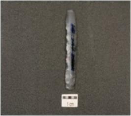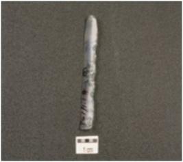 | Description / विवरण | A blade made on end struck, chalcedony flake, flake scars on dorsal side, bulb of percussion on ventral side, prepared platform proximal end and partly retouch cutting edges with used wear marks. |