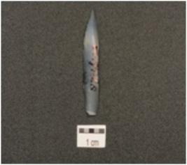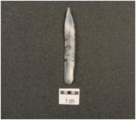 | Description / विवरण | Point made on chalcedony flake, pointed on one end and flake scars on dorsal side. |