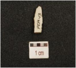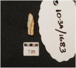 | Description / विवरण | A chert blunted blade with mid ridge on dorsal, triangular cross section, use wear marks on one cutting edge and broken along one end. |