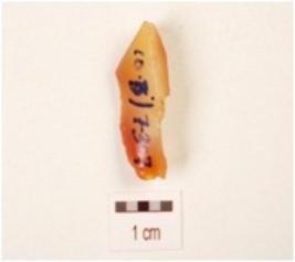 | Description / विवरण | A blade, made on carnelian with prominent mid ridge on dorsal side, use wear marks on cutting edge, triangular in section and dark red in colour. |