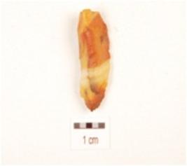 | Description / विवरण | A blade, made on chert with prominent mid ridge on dorsal side, use wear marks on cutting edge and triangular in section. |