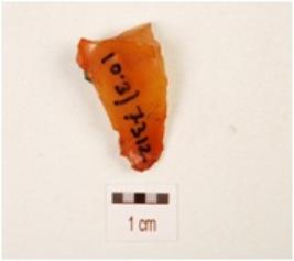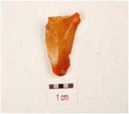 | Description / विवरण | A blade, made on carnelian with improminent mid ridge on dorsal side, bulb on ventral, use wear marks on cutting edge, triangular in section and orange in colour. |