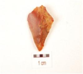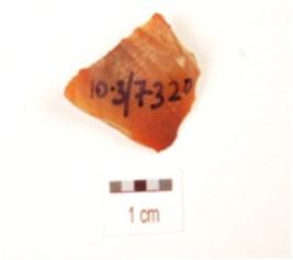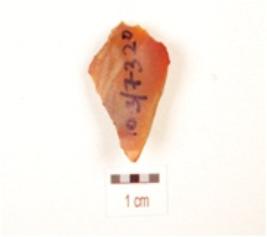 | Description / विवरण | A flake, made on carnelian end struck flake with prepared platform, bulb on ventral, use wear marks on edge and orange in colour. |